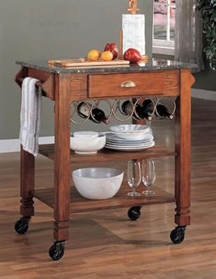 Cart in oak veneer finish with rectangular shape, marble top, storage drawers, wine rack, two deposit shelves, side handles and wheel base for easy moving. Practical design and style describe best this furniture. Buy direct from the manufacturer and save your $$$. Item usually leaves the warehouse within 24 hours.