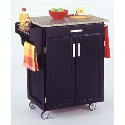 The freedom to conduct food /beverage preparation anywhere you wish sums up the entire appeal of the Home Styles Black Wood Cart. Whatever the task entails, this cart is more than up to it with an easy-clean granite table top, long utensil drawer and single adjustable shelf lower cabinet. Four wheel casters allow for freedom of movement and feature a locking function for safety. Two side-mounted towel racks and a spice rack add further practicality, while a black finish provides a definitive look. Features: Kitchen Cart features solid hardwood and engineered wood construction Kitchen Cart has a black finish Broad granite table top in salt and pepper finish Cart has brushed steel hardware Lower 2-door storage cabinet with adjustable shelf Utility drawer Built in spice rack with towel holder on one side Stainless steel towel holder on the opposing side Heavy duty locking rubber casters Assembly required Specifications: Weight: 128 lb Overall dimensions: 35.5" H x 32.5" W x 18.75" D