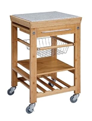 Dimension: 22"W x 22"D x 36.6"H Finish: Bamboo Material: Solid Bamboo with Granite Top Bamboo Inlaid Granite Top Kitchen Island Cart Expand your kitchen workspace with this natural finish work island featuring an elegant granite top inlay, constructed of solid bamboo. The cart is complete with chrome finished hardware, two towel hooks, a slide out wire storage basket, one fixed shelf, 4 bottle wine storage rack, a spacious pull out storage drawer, and heavy duty locking rubber casters for easy mobility and safety. The back of the cart is fully finished. Small enough to store neatly in your kitchen, yet large enough to provide extra work space needed. Simple assembly required Item is made in China.
