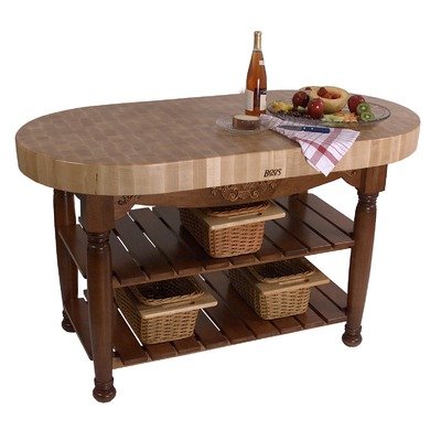 The Harvest Table makes a great kitchen island or buffet in any home! Made of wood, this kitchen work table features a hard maple end grain 4" top with standard Boos Block Cream Finish with Beeswax for chef-quality cooking results every time! Three wicker baskets are included for towels, fruit, vegetables and kitchen tools! The slatted shelves hold additional tools, books and small appliances! Comes in Useful Gray Stain. Assembly level/degree of difficulty: Moderate. Made in America