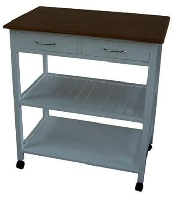 Deluxe kitchen trolley provides optimal kitchen storage to save counter space. Features wheels to allow easy transportation of kitchen tools, accessories, food goods, and accessories. Includes two-tiered storage areas below two storage drawers. Has a natural wood countertop and white finish. An ideal set for anyone who loves to cook.