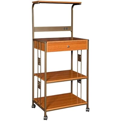 Functional, portable, and efficient, this Microwave Oven Kitchen Cart is the solution to your kitchen storage needs. The open shelves give you quick access to commonly used items and accessories, while the single drawer provides compact kitchen storage for a wide range items. Store your small kitchen accessories, utensils, dry goods, or plates, while utilizing the wheels to push the cart away when necessary. The decorative metal sides provide a great contrast to the finish. This piece features four casters for quick portability and a plug to make your microwave easy to integrate. Featuring metallic finished plastic hardware, this piece is easy to assemble and appreciate.Functional and portable and efficientOpen shelvingDecorative metal sidesLength 25.3Width 15.8Style TraditionalMaterial Metal; WoodHeight 60Color Cherry