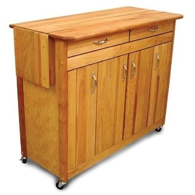 Our classically designed Super Island without the drop leaf. The large single drawer provides added room for hard to store items, while the adjustable shelves can be removed to store larger items The side knife rack holds 10 blades in a convenient, ready-to-use position Accented with satin nickel handles and side towel bar, the Super Island is a beautiful addition to your kitchen floor plan The oil finish seals and protect the wood Solidly constructed from North American Hardwood and hardwood veneer panels Center enclosed compartment with adjustable middle shelf Two smaller end enclosed compartments with adjustable shelf. Shelves can be removed to permit storage of baking sheets Handle/towel bar on side Heavy duty locking casters Oil finish Domestic hardwood top 42' x 20'