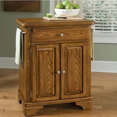 Finish:Oak, Top Finish:Natural Home Styles Premium Cuisine Kitchen Cart features a solid and engineered hardwood construction. Features: Two doors that open to a storage area with two adjustable shelves Spacious utility drawer Sleek towel bars on each side Hidden casters (2 locking) for added mobility Finished back panel